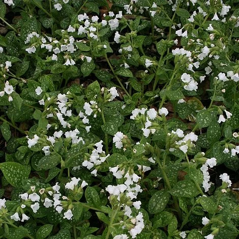 Despite its unattractive common name of Lungwort, Pulmonaria is a very pretty hardy perennial for ground cover in shady corners, or beneath trees and shrubs. The foliage of Pulmonaria ‘Sissinghurst White’ is felted, and mottled in white, and accompanied by striking white flowers throughout the summer. Bees love the nectar-rich blooms of Pulmonaria, and this variety is such a reliable plant that it has been awarded an RHS Award of Garden Merit. Excellent for cottage gardens and woodland plantings. Height: 30cm (12″). Spread: 45cm (18″). <br /><p>Culinary note: The leaves can be eaten raw or cooked and added to salads, or used as a pot herb. The plant is an ingredient of the drink Vermouth.