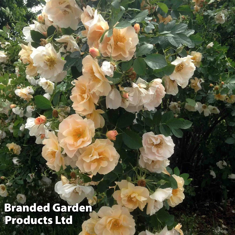 For gardeners with particularly cold sites, this showy new variety is a ‘must-have’! The canes are incredibly hardy, resisting cold winters and blooming reliably from late spring into summer, with some repeat-flowering later in season. The semi-double blooms are a gentle shade of apricot, fading to blush peach as they mature, and creating a beautiful two-tone effect across the entire plant.