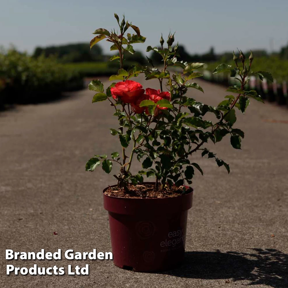A bright display of single, scarlet blooms adds an eye-catching splash of colour to summer borders. The glossy green foliage provides a handsome contrast with its bright summer blooms. This vibrant hybrid-tea rose has a compact, upright habit, making it perfect for sunny borders, rose gardens and containers. Height: 100cm (39″). Spread: 60cm (48″). A bright display of single, scarlet blooms adds an eye-catching splash of colour to summer borders. The glossy green foliage provides a handsome contrast with its bright summer blooms. Plant roses at the earliest opportunity following delivery. To avoid the risk from the build-up of harmful soil organisms and disease, choose an open position in full sun that has not been planted with roses in recent years. Roses enjoy a rich, fertile, well drained soil. Dig in plenty of well rotted manure or garden compost to the soil prior to planting roses and add a small handful of granular fertiliser to the planting hole.