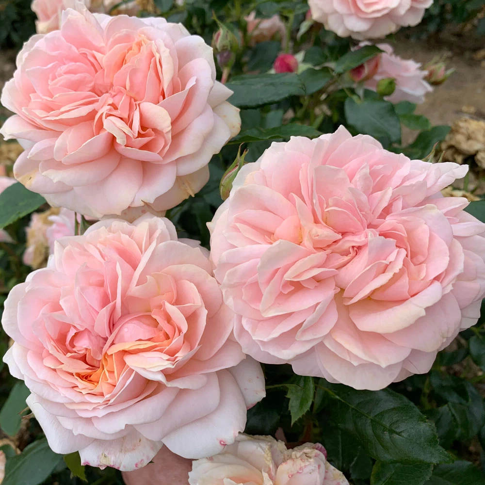 Joie De Vivre is a small, compact floribunda rose. Rose plants produce clusters of large old fashioned shaped flowers. Dark green foliage provides a wonderful backdrop for the blush apricot blooms that are produced in quick succession.