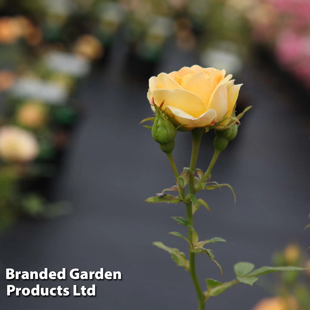 Rose ‘Yellow Fairy’ is a modern shrub rose, with a neat and bushy habit and glossy green foliage. It bears small, scentless, yellow semi-double blooms in flushes throughout the season. A lovely choice for filling gaps in sunny borders, or to grow as a patio rose in a container. Height and spread: 1m (39″). Plant roses at the earliest opportunity following delivery. To avoid the risk from the build-up of harmful soil organisms and disease, choose an open position in full sun that has not been planted with roses in recent years. Roses enjoy a rich, fertile, well drained soil. Dig in plenty of well rotted manure or garden compost to the soil prior to planting roses and add a small handful of granular fertiliser to the planting hole.