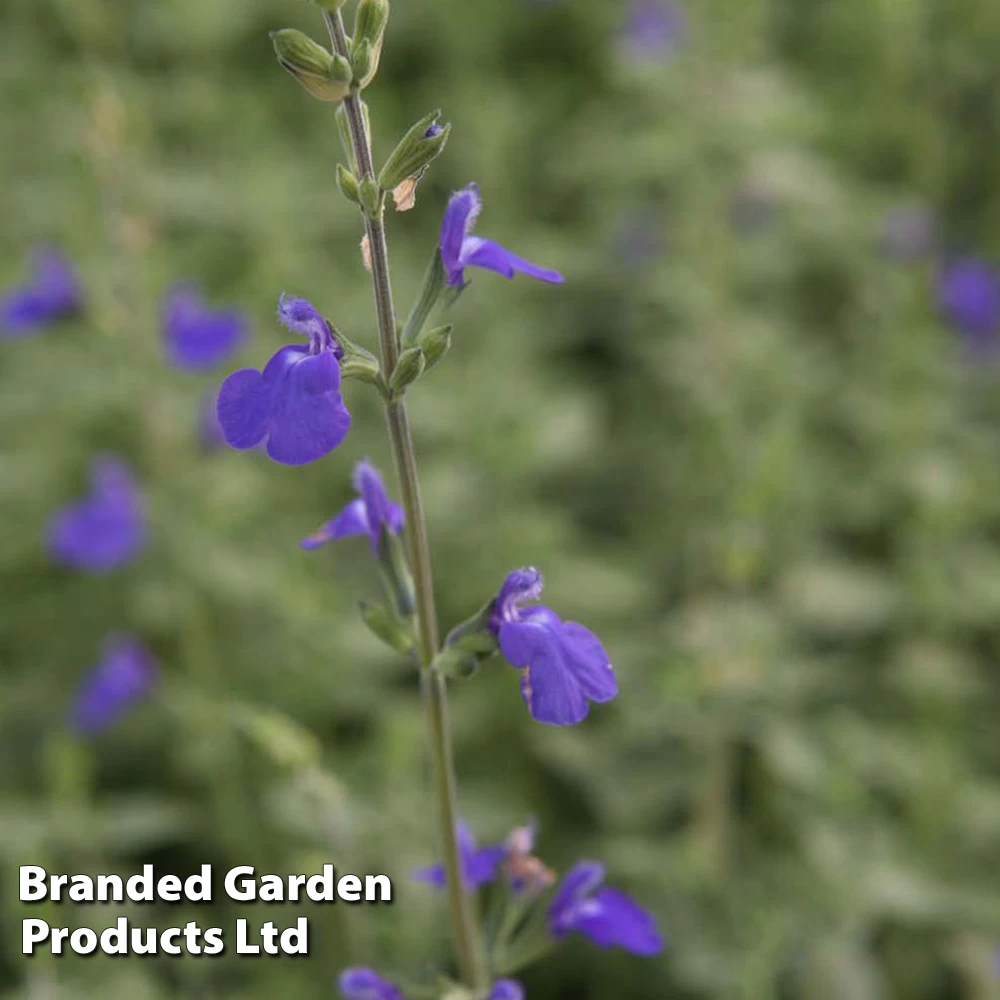 Salvia microphylla ‘Blue Monrovia’ is a bushy, shrubby perennial. In mild areas it may remain evergreen, although generally considered a semi-evergreen where winters are harsh and the plants are given no protection. This pretty Sage forms an upright clump of small, grey-green leaves contrasting nicely with the mauve blue flowers from July to September. Salvia plants prefer a moist, but well-drained soil in full sun, although once established they can also be very drought resistant. This perennial will appreciate a sheltered position with protection from strong winds and particularly hard frosts.