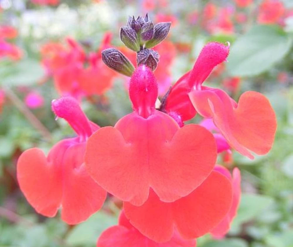 From late summer, the fiery, open mouthed, scarlet blooms of Salvia x jamensis ‘Royal Bumble’ are carried on wiry, dark purple stems. Small, aromatic green leaves crowd the bushy stems to form a rounded, dense mound. This perennial Salvia makes a fabulous container plant, and works hard in sunny borders where it will attract masses of bees and butterflies. Although perennial, this half hardy Salvia will appreciate some protection from winter weather. Height: 75cm (29″). Spread: 50cm (20″). Salvia plants prefer a moist, but well-drained soil in full sun, although once established they can also be very drought resistant.