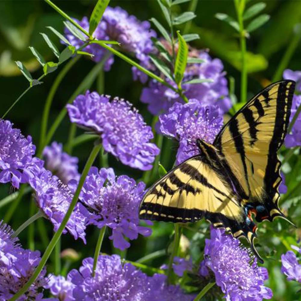 An abundance of blue pincushion scabious flowers will attract bees and butterflies throughout summer. Scabiosa ‘Blue Note’ blends well among cottage garden borders, where they look particularly effective planted in large drifts. Height and spread: 45cm (18″).
