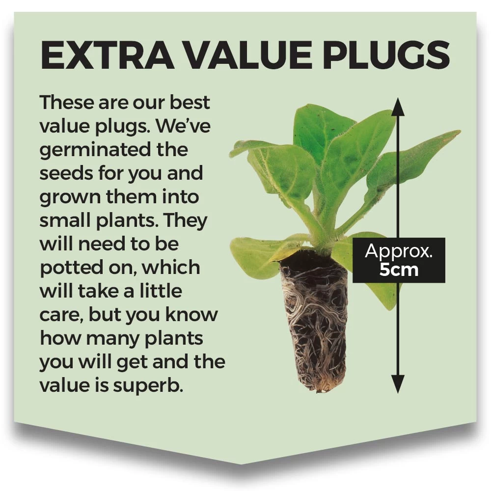 Garden Ready Plug Plants – Always ensure that the risk of frost has passed before you plant these into the garden. Should there still be a risk in your area then we suggest that you pot these plants into a 7 to 9cm pot and allow them to develop further somewhere warm and light, before planting, rather than leave them in the growing tray. For planting directly into the garden, ensure that the soil has been dug over and lumps broken down, then plant straight into their flowering position. In areas where the existing soil is poor, incorporate a good handful of compost into each area you are planting. Once planted don’t forget to give your plants a drink and protect them from any slugs and snails that may appear.