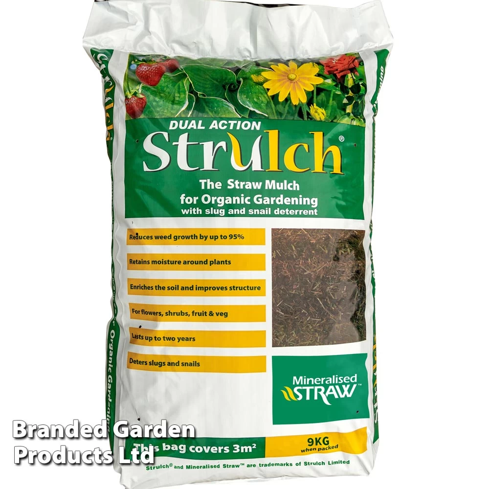 Strulch – Mineralised Straw Mulch, an environmentally friendly alternative to peat in compost and a more efficient way of using wheat straw as mulch. Lasting weed control tried and tested at the University of Leeds Experimental Gardens, The Earth Centre, The Eden Project and RHS Harlow Carr Gardens. Due to Strulch being made from wheat straw it makes a light and easy to use organic garden mulch. Strulch has a neutral pH and can be used on borders, raised beds, around vegetable and fruit plots. The straw can be left on the surface giving an earthy brown colour the first year then dug in and replenished in the second year.