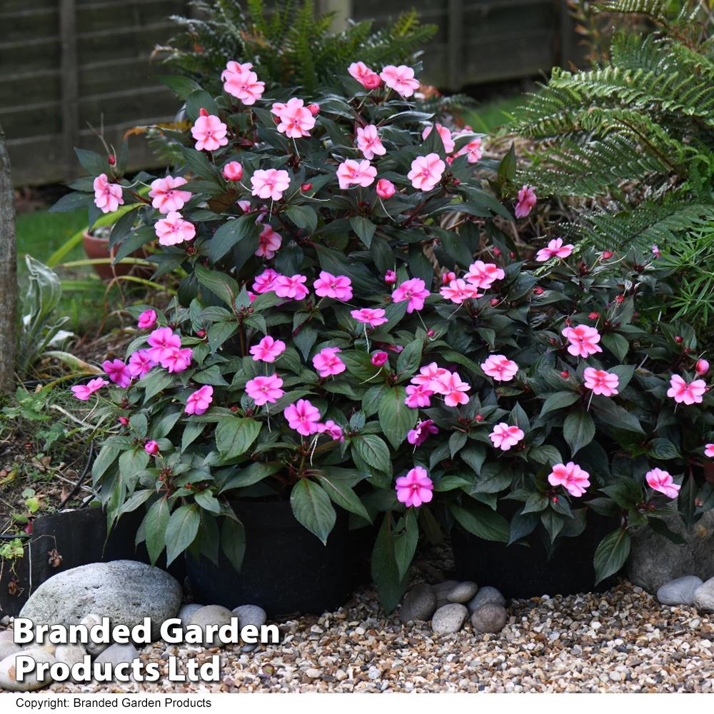 Enjoy Busy Lizzies in the sun! Pot up plants and grow them on in bright, frost conditions. While the plants are still small, pinch the growing tips out where the stems have more than 2 sets of leaves to produce a well branched, compact plant. When all risk of frost has passed, acclimatise Busy Lizzie plants to outdoor conditions over 7 to 10 days, prior to planting in their final positions.