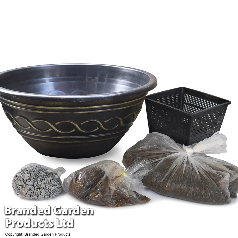 Water features add an extra dimension to gardens, and with this pond kit you can enjoy their calming influence in even the smallest of spaces. Empty the soil mix into the aquatic planting basket, and plant the rhizomes so that the growing point sits just below the soil surface. Cover the surface of the soil with the gravel to hold the compost in place. It is recommended that the planting basket is gently submerged in a bucket of water to allow the compost to become completely soaked through. This will allow any loose compost to float to the surface before you position it in the main planting bowl. Place the planting bowl in its final position – choose a sunny or lightly shaded spot. Transfer the planting basket to the bowl and then gently fill with water.
